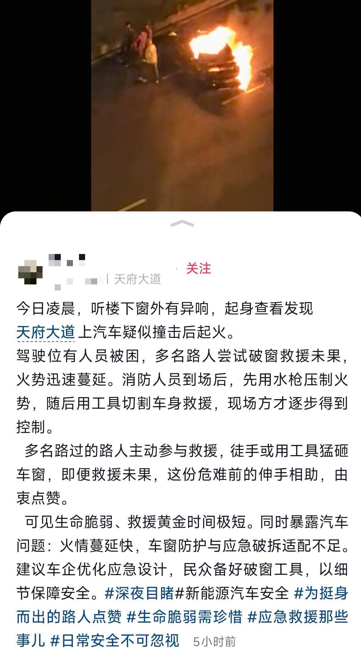 网传视频画面显示,车辆火势蔓延极快,导致救援工作异常困难。现场有多名路人主动参与救援,徒手或使用工具猛砸车窗,试图解救驾驶位被困人员,但未能成功。